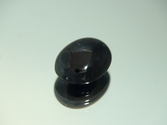 Dieser Saphir weist starke Einschlüsse und Spuren einer Wärmebehandlung auf. Der transparente Edelstein wurde zu einem ovalen Cabochon mit abgerundeter Ober- und Unterseite geschliffen.